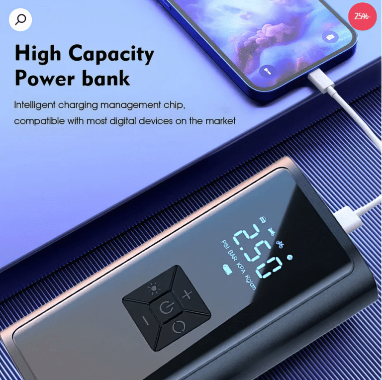 ✅ 2 في 1 – كمبروسر + كشاف طوارئ: جهاز متكامل يعمل كمضخة هواء قوية بالإضافة إلى كشاف إضاءة للطوارئ.